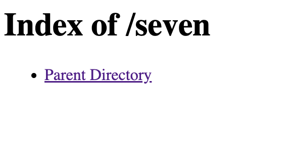 If you have a web server with nothing on it and visit the root directory via the URL, you’ll likely see an empty directory and/or an apache information page. Now, if you put an index.html file in there and visit the same URL without including “index.html”, it will still load index.html. Why? It’s part of the default configuration, at least for the apache web server. So if I had a directory called ‘seven’ on my local server and visited http://localhost/seven/, I would see this: